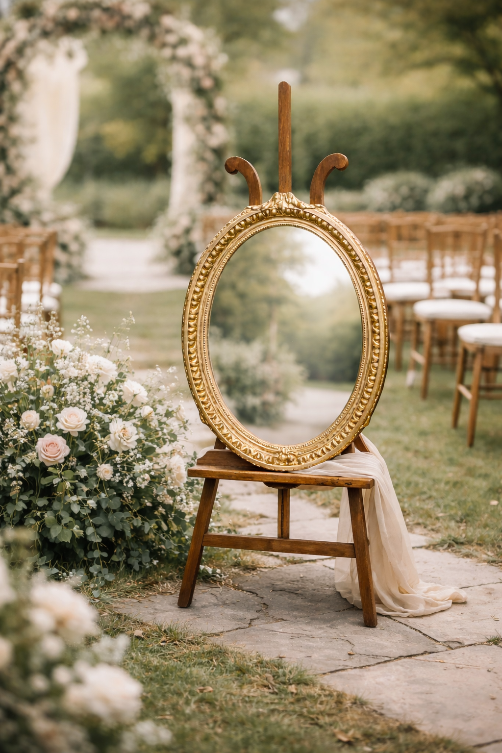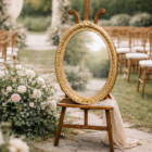 Ce miroir ovale au cadre doré, présenté sur un chevalet en bois réglable. Idéal pour les mariages, cérémonies laïques, accueils d’invités, plans de table ou espaces photos, ce miroir devient un véritable élément de décoration à part entière. Son style ancien et intemporel s’intègre parfaitement dans une ambiance mariage romantique, champêtre, bohème ou classique.